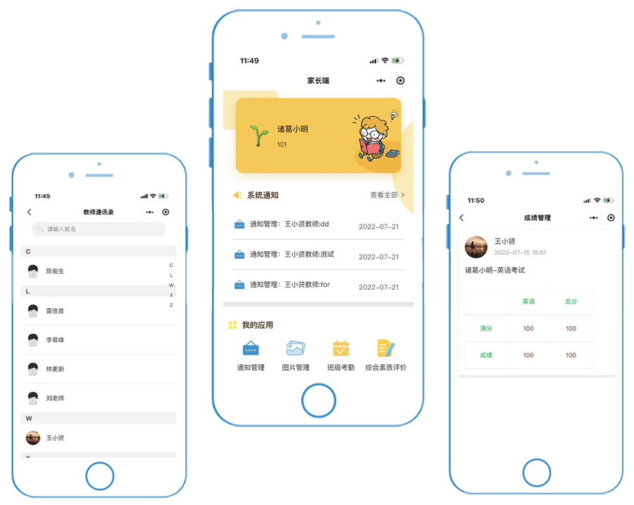 實現(xiàn)數(shù)字化辦公,對外向?qū)W生家長提供各種服務(wù),如:消息通知、請假管理,校園活動,學(xué)生動態(tài),教師通訊錄,學(xué)生定位等各種服務(wù)。對內(nèi)向教師提供各類服務(wù),如:班級管理,考勤管理,請假管理,活動管理,課堂點名,家長會管理,教師課程等等各種服務(wù)